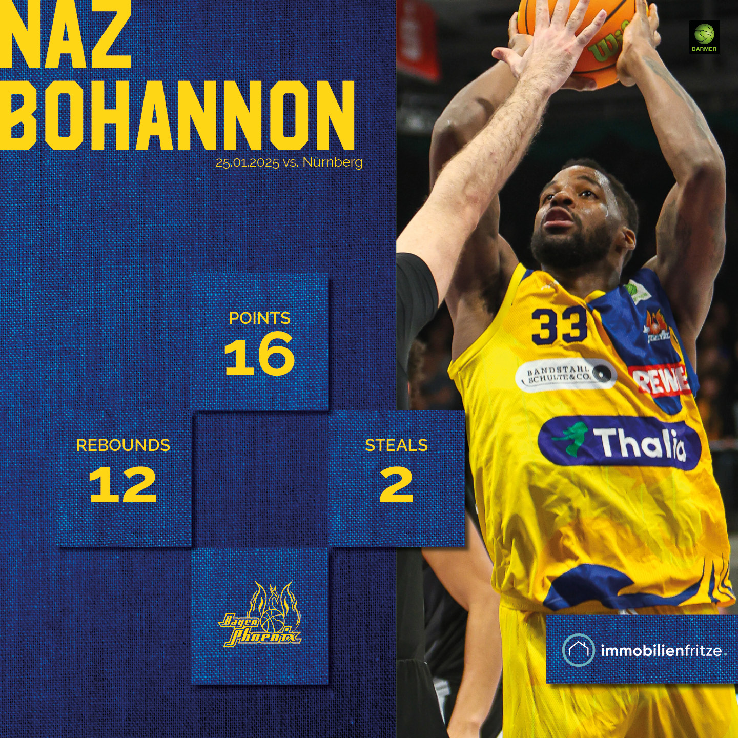 Dabei stemmte sich Naz Bohannon mit seinem vierten Double-Double der laufenden Saison gegen die Pleite. Doch die abstiegsbedrohten Franken präsentierten sich kollektiv gedankenschneller und erarbeiteten sich nach der Pause eine Führung von 16 Zählern (44:60, 28. Minute), welche Phoenix unter Zugzwang setzte. Mit dem Publikum im Rücken kam Hagen auf der Zielgeraden zwar nochmals auf Schlagdistanz heran (65:71, 38. Minute), verpasste aber das Momentum endgültig auf die eigene Seite zu zwingen.