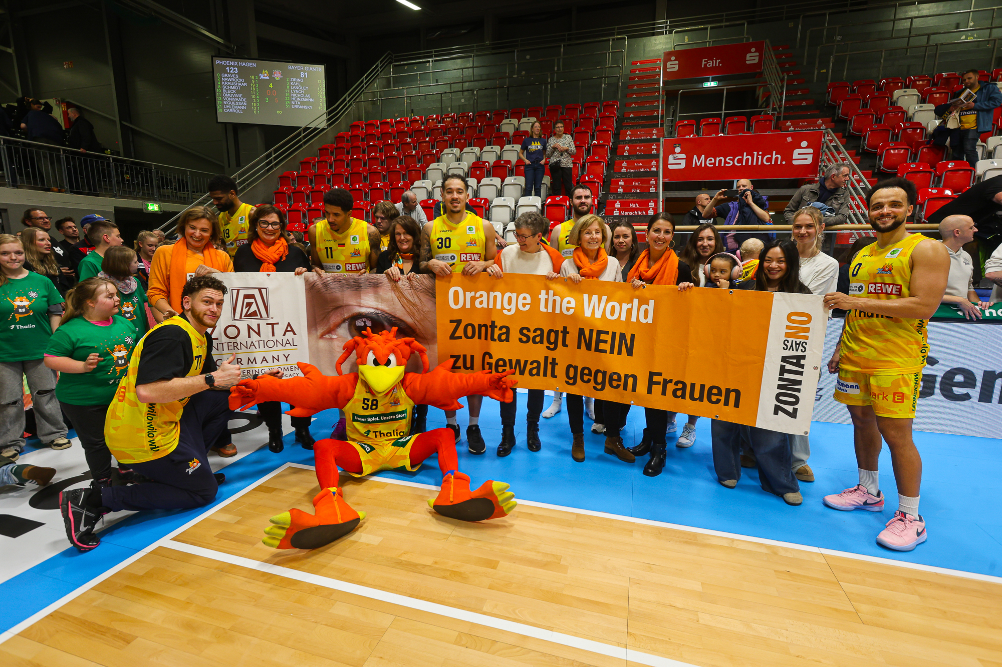 Im Vorfeld der am 25.11.2025 beginnenden Orange Days besuchte eine Abordnung des Zonta Club Hagen eines der jüngsten Phoenix-Heimspiele in der Ischelandhalle, an dessen Anschluss ein großes Gruppenfoto mit den Spielern und ihren besseren Hälften auf dem Feld entstand.